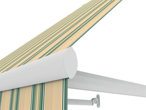 Bei der Royal-Life Kassette sind die hochhebenden Aluminium-Arme mit Federn ausgerüstet, die den Stoff spannen und die Fallarme gegen Wind stabiler machen . Das Markisengewicht wurde auf die Arme und Tragkonsole so verteilt, dass die Markise auch dort befestigt werden kann, wo die Montage einer Terrassenmarkise aufgrund eines instabilen Untergrundes nicht möglich wäre. Die leichte Konstruktion macht die Montage sehr einfach.