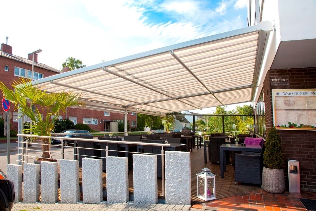 Fühlen sich Ihre Gäste wohl, erzählen sie es weiter - die beste Werbung für jedes Geschäft! Die attraktive Aufmachung des Außenbereichs spielt hier eine wichtige Rolle. Wie gut, dass ein individuelles Markisendesign bei VARISOL selbstverständlich ist. Bei freier Auswahl aus fast 200 Tuchdessins bleiben keine Wünsche offen. Mit edlem Design und leichter Handhabung verspricht die T400 angenehme Stunden auf jeder Terrasse. Bis zu 36 qm Tuchfläche spenden bei maximaler Markisenbreite von 6.000 mm und einem Höchstausfall von 6.500 mm einem enormen Außenbereich zuverlässig Schatten. Der Markisenantrieb erfolgt bequem über einen serienmäßig installierten 230V-Rohrmotor. Eine elektronische Endabschaltung gewährleistet ein sanftes und punktgenaues Abschalten des Motorantriebes. Noch mehr Komfort bietet ein Funkmotor mit Fernbedienung, der als Sonderzubehör lieferbar ist.