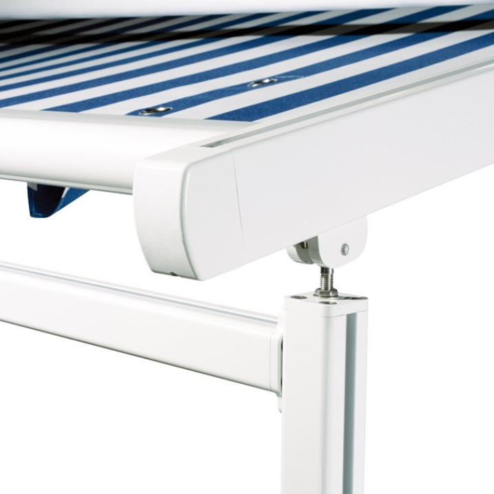 Die Fallstange besteht aus einem extra starken Aluminium-Strangpressprofil. Wandstärken von 2,5 mm sowie die Dimensionierung von (BxH) 120 x 68 mm ermöglichen eine einteilige Markisenbreite von 6.000 mm. Seitlich ist die Fallstange durch Aluminium-Seitenkappen verschlossen, in denen die Laufrollen auf fliegenden Edelstahlbolzen gelagert sind.