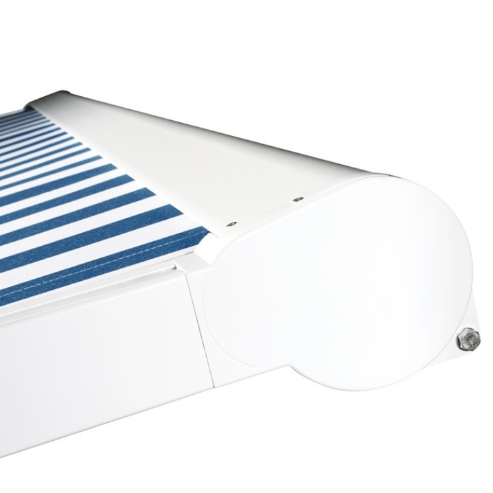 Der Markisenkasten ist aus zwei Aluminium-Strangpressprofilen zusammengesetzt. Die Wandstärke der Profile beträgt 2,5 mm. Der Kastenboden und das Dachprofil werden im hinteren Bereich über ineinander greifende Nuten miteinander verbunden. Seitlich wird der Kasten durch stabile Endkappen aus Aluminiumguss verschlossen. Das Kastendach verfügt über eine Tiefe von 231 mm und überdeckt das Fallstangenende im eingefahrenen Zustand. Die Kastenhöhe beträgt 171 mm. An beiden Seitenkappen befindet sich im hinteren Be-reich eine Aufnahme, mit denen der Kasten einfach und sicher in Wandkonsolen eingehängt werden kann.