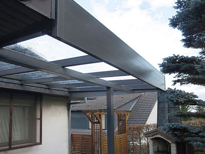 Das Flachdach kann mit Wandanschluss oder freistehend und jeweils an der Vorderkante mit und ohne Überstand geliefert werden.